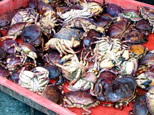 There were live crabs in a large box. The crabs were blue and pink and much bigger than Virginia crabs.