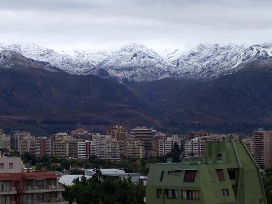 We also got a wonderful-smelling lavender shrub, and some small white flowers. Once home, as a treat, we got a pot of chirimoya ice cream. In English, the fruit is known as Custard Apple or Cherimoya. It has a greenish color on the outside and white inside, with large brown seeds. It's delicious! To find out more about cherimoya, go here. Unlike Virginia, where it rains a lot in the summer, we had not gotten a single drop in Santiago. But finally, we got some a few days ago. It rained all day, and when it cleared up, RJE and I looked out the window and saw...SNOW! It was only on the mountains, but we were very surprised to see snow in the middle of summer. It was beautiful. Here is a picture: