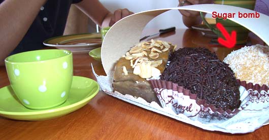 The Chilean president is a woman, and she lives just a few blocks away from us! We walked by her house a few days ago. There were a lot of policemen standing around in the neighborhood. Many of the policemen were police WOMEN. They wear a green uniform with a cap. In Chile and Argentina, the president lives in his or her own house, and works in a separate office building. In the U.S.A., the president lives AND works in the White House. Instead, the president of Argentina works in the Pink House (La Casa Rosada), and in Chile she works at La Moneda, which means "the coin," the name the building had a long time ago, when it was the place where the government produced coins. When we stop at parks on our walks, we always see dogs. I named one that I see all the time Mr. Sooty, because he is black. There are also two fat pugs that walk around with their owner. We call pugs "Suki dogs" because our old friend Suki was the first pug me met. On our way home from the park, a fluffy white cat is always sitting on the window sill of an apartment building next to ours, watching all the pigeons go by. The Spanish word for pastry shop is Pastelería. We see them everywhere, so we get some treat at least once a week. The closest one is in an old house that has parking signs outside in German, I think because the owners may be German (the shop is called Pastelería Franzel). Last week we bought blueberry muffins and one chocolate-chip muffin. Dad didn't know what blueberries were called in Spanish because he said he never saw one when he was a kid. Now, we all know what it is: Arándano. RJE and I wanted to try out a pastry ball covered with coconut that looked very good. Mom said it was just a sugar bomb---mostly made of dulce de leche (milk cooked with tons of sugar until it becomes brown and creamy) and pieces of dough and coconut. We just had to buy one, and it was a bomb!