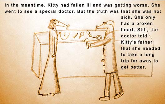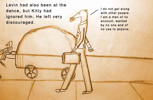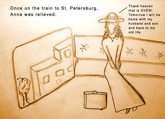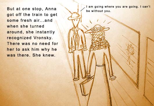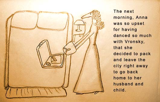 The WHOLE thing is only a little bigger than our bedroom in Virginia. My friend and I played soccer and tennis and even saw two giant, hairy tarantulas. One of them was dead, and the other was alive! I wish I had taken a photo of them, but I forgot. Their hair was yellow, and you could see their many eyes. It became so hot, that we got hosed down in our clothes. And after that, we were freezing. There's no Spring Break here in April because it is not spring. But they don't have a Fall Break either. Instead, we got Thursday and Friday off because it is "Semana Santa," or Holy Week. Most people didn't work on Good Friday, and most stores were closed. It felt like a Sunday. Many people went out of town during this long weekend (wikén!), but we stayed here (except that I went to the parcela for a day). We've been using the extra time at home to catch up with "Anna Karenina" because we haven't even finished Part One of the eight parts of the book yet. If we want to finish the book by the end of the year, we have to hurry up. So here are five more drawings to close Part One and start Part Two. Anna Karenina #13