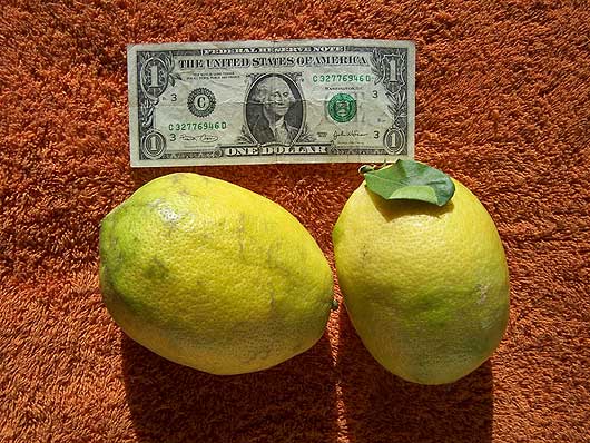 Unfortunately, the pomelos were still green, so we couldn't have any. But they did give me some of their giant lemons to bring home. Just look how BIG they are: