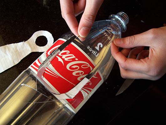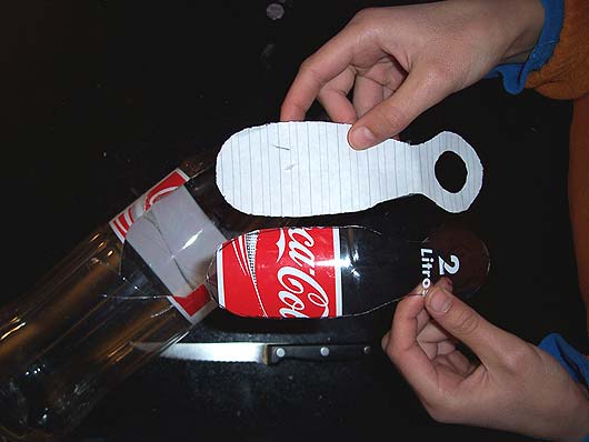 First, I drew the pattern on a piece of paper. Then, I traced it on the bottle with a marker. With Dad's help, I cut it out with a knife.