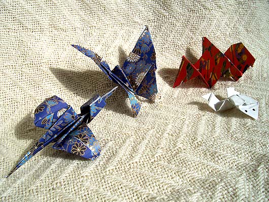 I first heard about these books in fifth grade, when the class made a model of Judy Moody to hang on the classroom door. I never read the books in English because, in fifth grade, they seemed too basic. But in Spanish, they are perfect for me BECAUSE they are basic, since sixth-grade books in Spanish are still a bit difficult for me. The one I am reading now is "¡Judy Moody se vuelve famosa!" ("Judy Moody Gets Famous!"). I already read the other one "Judy Moody salva el planeta" ("Judy Moody Saves the World"). All the Judy Moody stories take place in Virginia. She is a third grader who wants to become famous by doing all kinds of things---like saving the world, getting her picture in the newspaper for winning a spelling bee, etc. It's exiting to read these books in Spanish because I can understand almost everything. ------------------------- My aunt read, on a previous RatSoap post, that RJE likes doing origami, so she brought RJE a really nice origami kit. It has a book full of hard-to-follow origami instructions, and fifty square sheets of colorful paper. We all tried to do some samples from the book. In this picture, you can see a butterfly, a dragon, and a frog.