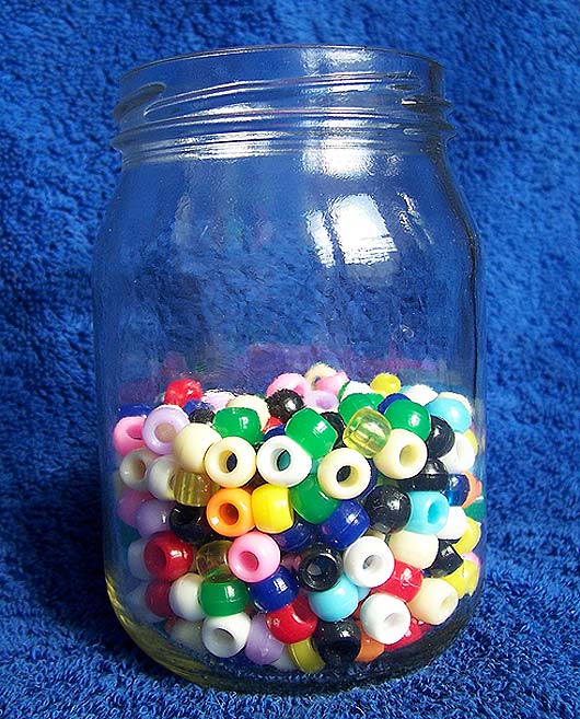 The one that actually looks like a bird (on the left) came with the kit, already made. ------------------------- RJE got home from school the other day very scared because they told her she was going to have shots the next day. Everyone in first grade (that means RJE!) had to have the shots for measles, mumps, and rubella. Fortunately for her, Dad had the documents to show that she had already had those shots in Virginia, where you're supposed to get them BEFORE you start kindergarten. Here, they wait until first grade. I don't know anyone who has had measles, mumps, or rubella, but Dad says that when he was little, shots for these illnesses didn't exist. So he had all illnesses, and he says that mumps was especially awful. With mumps, the inside of your mouth starts to swell and peel, he says, and you get a fever and suffer a lot of pain. I am glad we have shots for it now. I remember when I had the chickenpox, and THAT was awful---right after Christmas at my grandparents' house. When I got back to Virginia, the first Harry Potter movie was showing in the theaters, and I went to see it still with pox on my face (NOT contagious!). The movie was so good, it made me forget about the itching for a while. ------------------------- In my school in Virginia, all kids I know have at least one sibling. I thought that in Chile almost everyone would have five or more brothers and sisters and have a huge family, because Dad's family had four children, and when he went to school here, most kids also had big families. But it's not the same today. In my class here, there are several children who have no siblings, and I can't think of anyone like that in my class in Virginia. Also, our teacher asked in class the other day to raise hands for whether we had been born naturally or by cesarean. Almost the whole class raised their hands for cesareans! Only four of us in the class of 34 were born naturally. ------------------------- A few years ago I participated in a contest. There was a jar filled with jellybeans, and the competitors had to guess how many beans were in the jar. That gave me the idea to do a contest just like it, except with beads instead of jellybeans. The whole family participated, except me (because I counted the beads). Everyone guessed a different number, and then I announced the winner (the person who had the closest guess). Dad won. Then we thought it would be a good idea to offer the contest to RatSoap readers. So look at this photo of the jar (the jar is 4.75 inches tall) and take a guess in the form below.