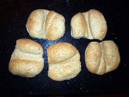 When she got home, she said she wasn't going to eat candy for a whole month, and that she was very tired and going to bed. The next morning, we caught RJE eating chocolate chips and candy on the balcony. Now, the "sugar queen" is not allowed to touch any kind of sweet for a month. --------------------- After Halloween, we got Thursday and Friday off because it was All Saints Day, November 1st. To celebrate All Saints, everyone goes to the cemetery---so there were lots of traffic jams and lots of people buying flowers that day. The metro station at the entrance to the main cementary in Santiago (the one we visited months ago) was so crowded, that they had to shut it down. --------------------- I took a test in English class and one of the questions was "What is the superlative form of modern?" I wasn't sure, so I figured that since "modern" has only two syllables, according to the rule, the answer had to be "modernest." It sounded right to me, so I just put that. But when I got home, Mom and Dad said, "Noooo!" That it was "most modern," because the rule is "if the adjective is TWO syllables or more, and does not end in Y." This is the first test in English that I get lower that 100%! The teacher still hasn't given back the tests, but I will be very embarrassed when she hands me mine. ---------------------- Since our last RatSoap contest went so well, Dad got an idea for a new one. This is a picture of some bread they sell here that is called "Marraqueta":
