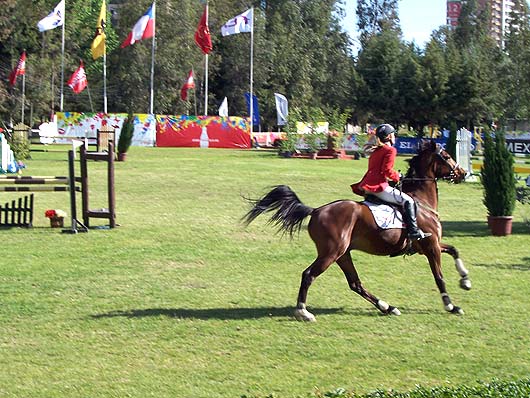 The riders had nice outfits on and were holding a whip in their hand. One contestant had to use the whip because her horse went to the side when it was supposed to jump. --------------------------- I didn't know that they celebrated Halloween in Chile. I thought it was only an American celebration. But when I looked it up on the Internet, it said that Halloween isn't from the U.S.A. It actually came from Ireland, and the Irish took it to America when more than one million people moved from there to the United States in the 1840s, escaping starvation. Halloween started as a party of the dead, where people sacrificed animals to the spirits because they were scared of them. They also dressed up in costumes so that the spirits wouldn't recognize them. Well, they now celebrate Halloween in Chile, too, and my friends invited me to a sleep-over on October 31st. I went with my costume already on: