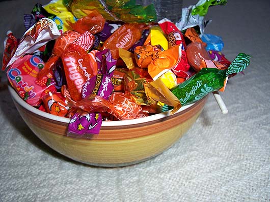 It was strange, because when you paint your face this way, you ALWAYS look sad unless you smile. Before we went trick-or-treating, we played some soccer in our costumes, and my friend told me, when my team was loosing, "Don't look so sad!" My friends liked my costume. Others dressed up like vampires. One friend had scars on her face and a knife going through her head, until a mother of two small children asked her to take the knife off because it was scaring the toddlers. In our group, we also had a widow, a witch, another witch, and a few devils. When we went trick-or-treating, one lady asked us to do something before she gave us candy, so I did a mime act, and we all sang a song. When we finally went to bed that night (past midnight), we counted our candies. I had 174, but most of them were small suckers. Then we watched "Scary Movie 3," which I didn't want to see. My friends had the volume blaring, and the movie was in English, so I could understand everything (tons of bad words). It was VERY violent and scary (for me), and I had to close my eyes and ask my friends to turn the volume down. Everyone else said that the movie was supposed to be a comedy, but I had never seen it, so it scared me. --------------------- RJE also went trick-or-treating with one of her friends. She dressed up as a tiger, and she and her friend went to every single apartment in three huge buildings. She was starving because she didn't have dinner before going, so she ate a bowl full of candy instead.