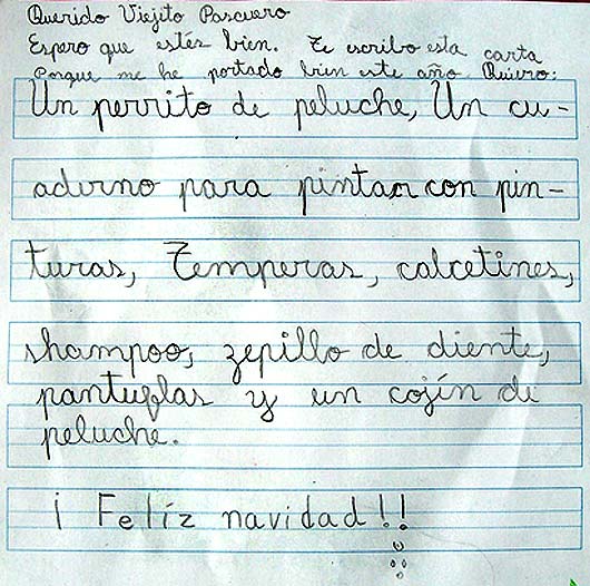 Early Santa When we walk home from school, we almost always take a shortcut through the shopping mall across the street. In the last week of November, they already had a Santa Claus in the mall, letting kids sit on his lap for photos. I thought it was weird to have Santa out when it wasn't even December yet. Santa always waves to us. He even caught RJE being bad one day, as we walked past him. He just smiled. And RJE wasn't worried. When we got home, she pulled out the "Santa letter" she'd written at school that day to show us: