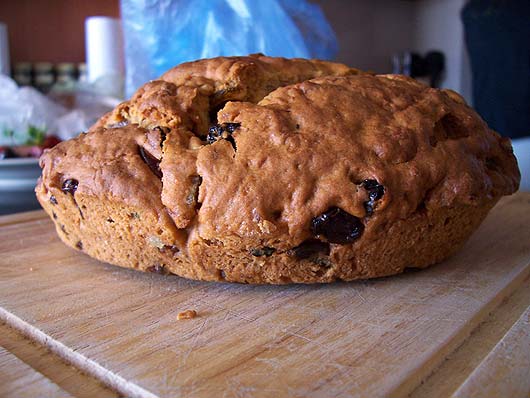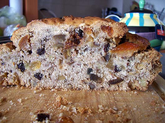 RJE cut up the almonds, walnuts, figs, raisins, and currants. I helped mixing the flour and other ingredients. It is very hard to stir and takes a lot of work, but it's worth it. Here's what a loaf looks like on the inside:
