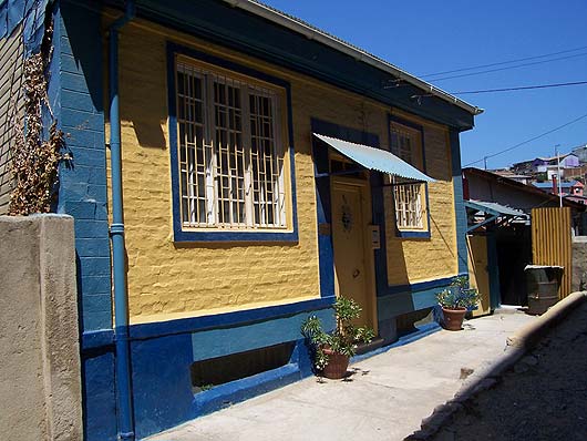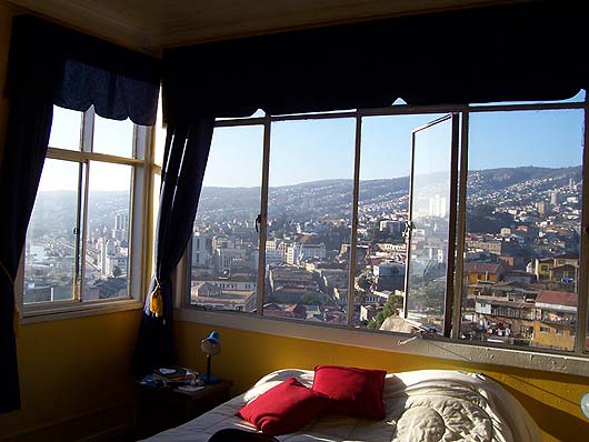 The B&B is called "The Yellow House," and it is owned and run by a couple who bought the house two years ago. She is Chilean and he is Australian. The house is built into the hill, and Martin and Lissette (the owners) live on the first floor. Each floor has a great view to the port. The front door is on the third floor and opens to a narrow and unpaved alley just wide enough for one car. The house is bright yellow on the outside, with blue trim, which is the same color that the "ascensores" (the funiculars that take you up or down the hill) used to be painted. Now they are all red and white.