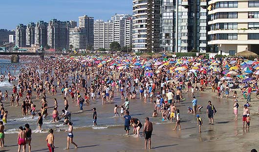 In Viña, we went to the beach every day to dig holes and make sand castles. We didn't swim because the water was too cold and the waves too strong. And there were so many people at the beach, you could hardly move. Here, RJE and Mom are lost in the crowd (you can see them at about the center of the photo):