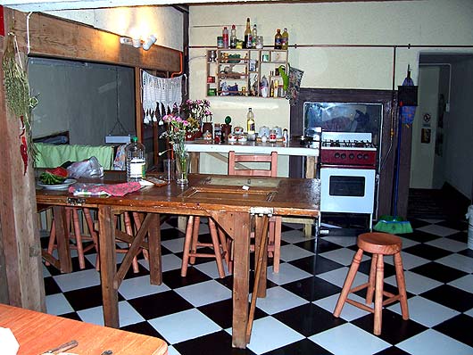 5) After the beach, what my friend's mom calls the "merienda," because she is from Spain and that is what Spaniards call tea time (Chileans call it "onces"). 6) After that, we played ping-pong and stayed up late playing cards and watching MORE television! They usually eat something else at night too, but not a huge meal. The most interesting part of my whole time in Quintay was when my friend's dad forgot the keys inside the apartment and somehow the door closed and locked by itself. We were all locked out and the windows were closed, too, except the one in the bathroom, which was very high and didn't open very wide. So both families (this was when my parents were still visiting) went to inspect the bathroom window and open it a bit wider---wide enough for a kid to get in but not quite enough for a grown-up. First we tried to get RJE to go in, but she chickened out since she is afraid of heights. Instead, I climbed in and opened the door. When I was scrambling through the window, I noticed a lady outside looking at us like we were wackos. She probably thought we were trying to steal something. I was sure she would call the police. ----------------------------- After Quintay, the girls in the family got invited for two nights to a condo that a friend of RJE's was staying in for the summer in a place called Concón. Dad had to stay in Santiago and work. Mom and Dad said that when they were in Chile years and years ago, they stayed in Concón for a month, but in the "Playa Negra" part, which means black beach. There were no condos back then. Now there are too many. This time, we were in the part called "Playa Amarilla," the yellow beach. The condominium we were in had one bedroom and one bathroom. We sort of "camped out" in the living room, but then got kicked out because there were more people coming and there just wasn't enough room. RJE stayed with her friend a few more days, but Mom and I went back to Valparaíso. Instead of going to The Yellow House again, we went to a hostel where you have to sleep in bunk beds, share a big room with other people, and share the bathroom down the hall. The hostel was called "Patiperro Hostel," which means something like the wanderers' hostel. As soon as you enter the hostel, there is a curved and carpeted staircase that leads to a hallway. There is a living room with a TV, DVD player, sofas, some card games, magazines, and a computer. You can use the kitchen anytime, and it has a long table made of an old door with stools and all the supplies you need to cook.