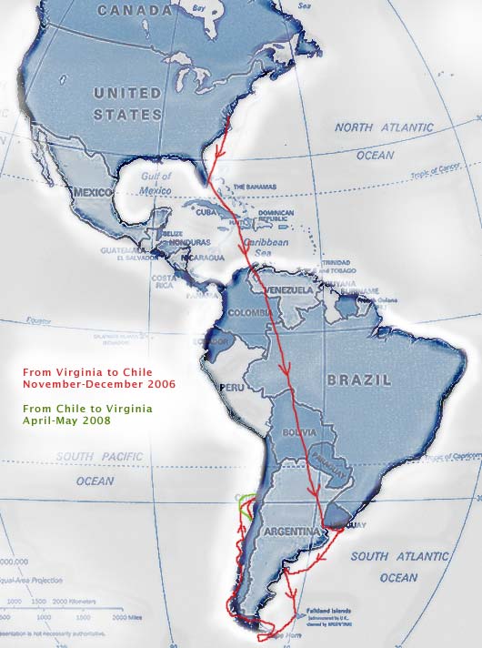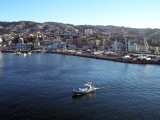 The first stop on the journey was Coquimbo, the same port town we visited on the other ship back in December of 2006. Here is a map of the journey south back then (in red), and this one (in green):
