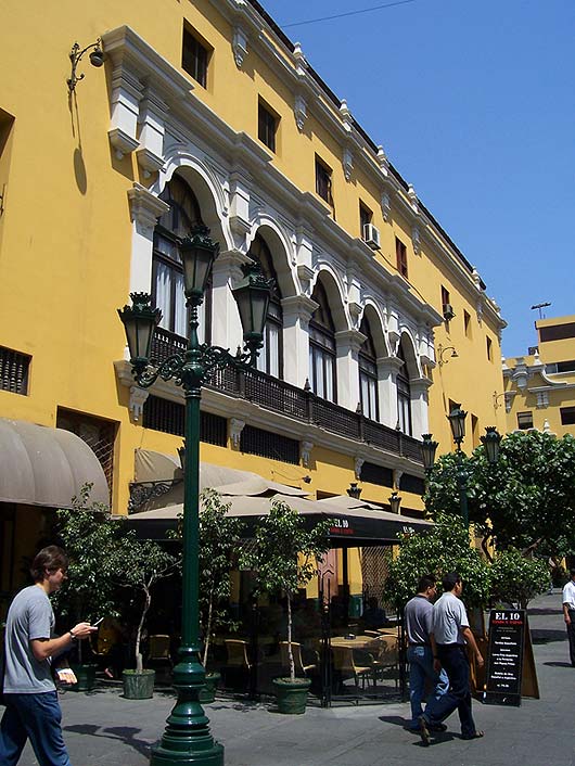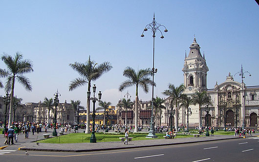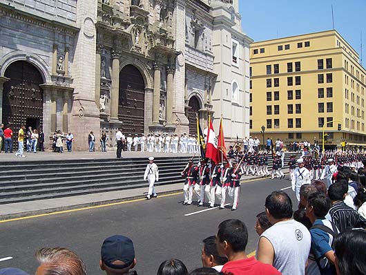 Callao, Peru, is a lot older, though, founded in 1537 (70 years before Jamestown, Virginia). And it is so large, that it is now part of Greater Lima, the capital of Peru---and Greater Lima has TEN million people living in it. When we got off the ship, there were police officers telling us to be VERY careful, that it was dangerous to walk around and that we should take care of our things and the children (us!), which scared me. Callao, Peru, is dusty and dirty. We drove through it as we went to downtown Lima in a taxi. We visited the central plaza in Lima (the "Plaza de Armas"), where a military band was marching.