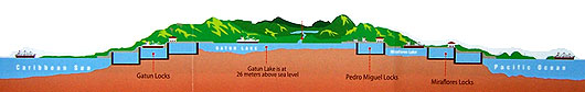 Below, you can see (from right to left), how we got to Gatún Lake at the center of the Panama Canal, going up from the Pacific Ocean: