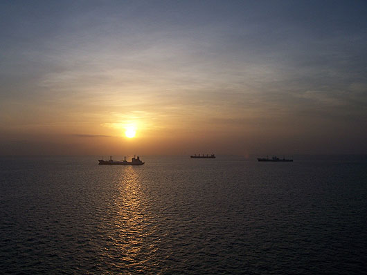 The sun was coming up and there were already many ships waiting to cross. The Canal is like a river with green, jungly islands all around, and some small boats and tugboats in the water, ready to help the big ships pass through.