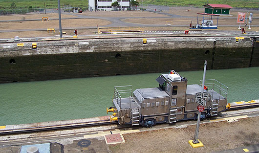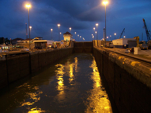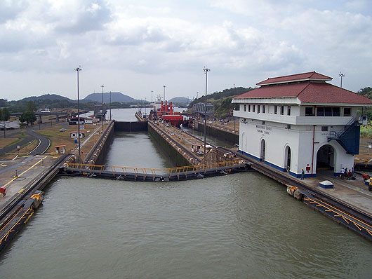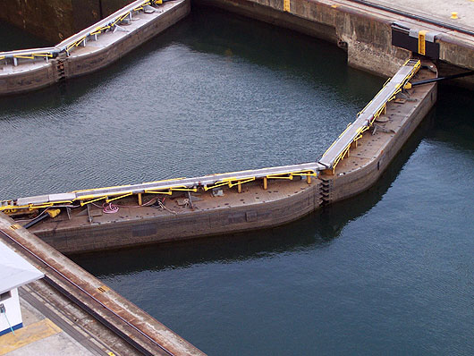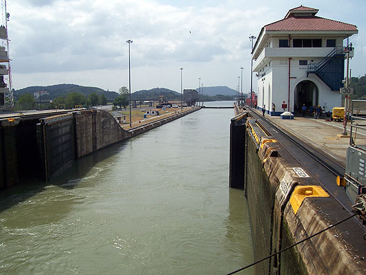 After the lake, we reached another lock with three chambers to go down the 85 feet back to sea level, on the Atlantic Ocean side. As we went through the Canal (it took 12 hours!), a lady narrated the history and details: